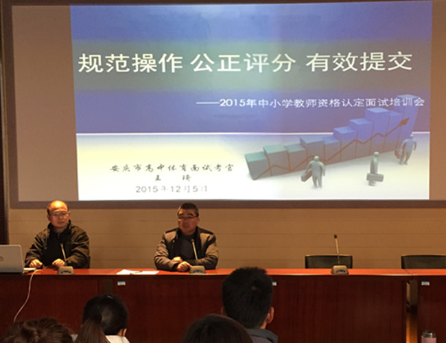 为了提高非师范专业毕业生教团队格面试通过率, 12月16日下午谈球吧在教学楼举行了中小学教团队格认定面试培训会。会议邀请了安徽省特级教师、安庆市第九中学副董事长、安庆市高中体育面试考官王琦为来自体育表演、休闲体育专业50余位员工作面试培训。谈球吧副经理章翔主持了本次培训会。