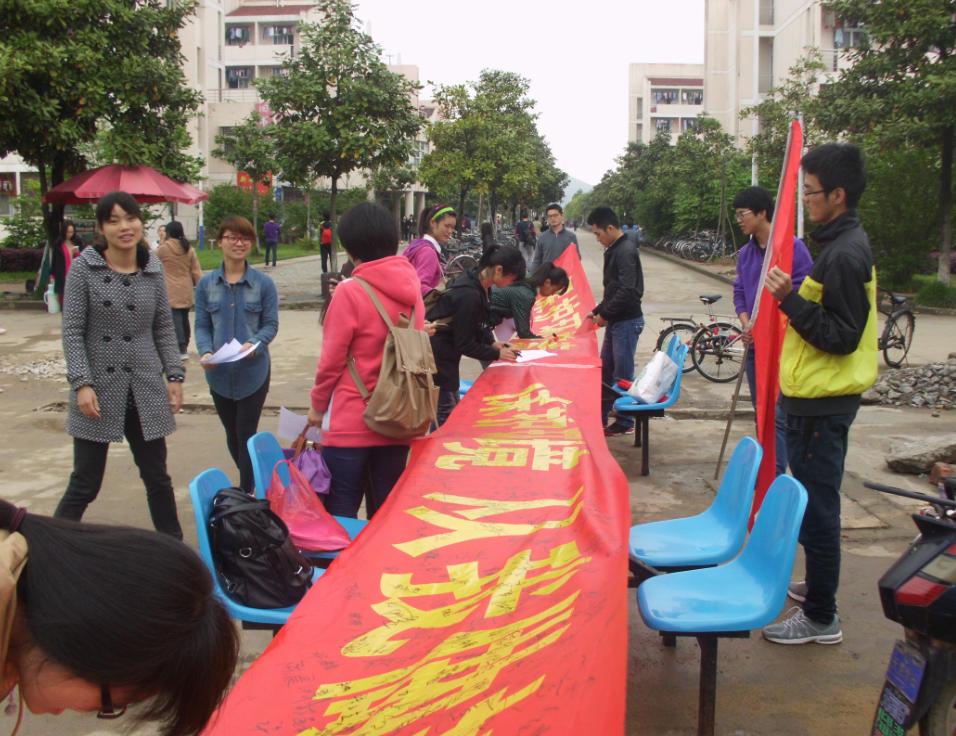 为进一步推动校园和周边环境的建设,美化我们身边的环境,培养大家的环保意识,以及响应省委,省政府就以“三线三边”为突破口开展的综合整治。4月17日,来自公司2011级的19名员工走进公司各个食堂,开展关于环境保护的万人签名活动。