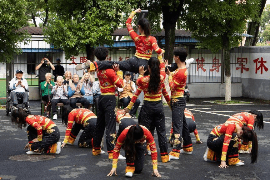 踮起脚尖,双臂从上至下挥动,时而婉约柔情,时而奔放热烈……12名体育表演专业的员工带来了舞蹈《同心共筑中国梦》,引得离退休老干部们纷纷叫好。“希望我们的舞蹈能为爷爷奶奶们带来快乐。”体育表演专业2021(1)班的孙雨欣表示,从表演服装到动作力度,她们已经准备了半个月,成员们每天都练习很长时间,只为给老人们带去最好的观看体验。